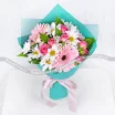 гербера розовая - 2 шт, хризантема кустовая ромашковая - 2 шт, роза кустовая розовая - 1 шт, рускус, упаковка, лента. Примерный диаметр букета  25х25 см.