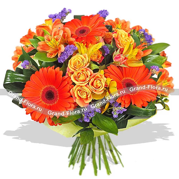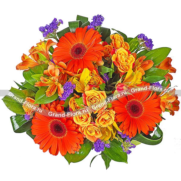 ДЕЛЮКС: гербера оранжевая - 9 шт, роза кустовая оранжевая - 7 шт, альстромерия оранжевая - 11 шт, статица фиолетовая - 5 шт, рускус,фетр зеленый.
