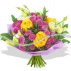 Букет выполнен из ярких желтых роз, с яркими акцентами фиолетовой кустовой хризантемы сантини  и кульминацией в виде эустомы, свободно расположенной по периметру букета. Завершает композицию фиолетовый фетр. Диаметр букета от 25 см до 45 см,в  зависимости от выбранного Вами варианта букета. Высота букета от 40 см. Обращаем Ваше внимание, что состав и оформление букета могут отличаться.