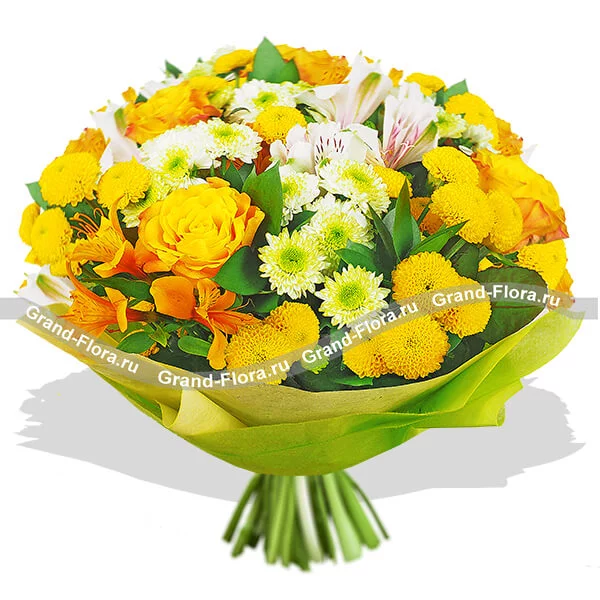 ДЕЛЮКС: роза желтая /оранжевая- 11 шт, хризантема кустовая желтая - 7 шт, альстромерия желтая - 5 шт, альстромерия белая - 4 шт, хризантема кустовая белая - 7 шт, рускус, фетр зеленый.  Примерный объем букета 40 и более см.