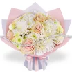 Уменьшенный: роза розовая - 1 шт., хризантема кустовая белая - 1 шт., гвоздика белая - 1 шт., роза кустовая белая - 1 шт., хризантема кустовая сантини - 1 шт., упаковка, лента.
