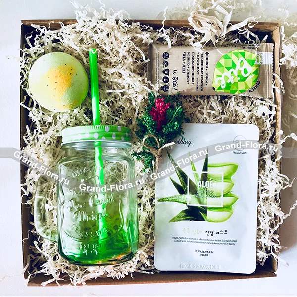 Стандартный: баночка-кружка с крышкой и соломинкой - 1 шт., тканевая маска для лица с экстрактом алоэ - 1 шт., бомбочка для ванны «Цитрус» - 1 шт., полезный батончик из злаков, орехов и фруктов - - 1 шт., подарочная коробка, декор из сухоцветов.